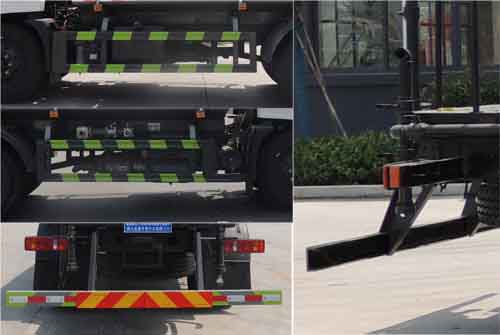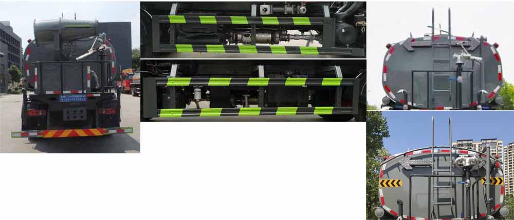 罐體總容量:9.77立方米,罐體有效容積:9.3立方米;罐體外形尺寸(×長軸×短軸)(mm):4200×2300×1450,4000×2300×1540;ABS型號/生產廠家:3631010-C2000/東科克諾爾商用車制動系統(十堰)有限公司,ABS 8/東科克諾爾商用車制動系統(十堰)有限公司,4460046450/威伯科汽車控制系統(中國)有限公司,J ABS/焦作博瑞克控制技術有限公司.隨底盤選裝駕駛室,選裝底盤附件位置,選裝噴霧裝置樣式;所用材料材質、連接方式以及后部防護裝置的主要尺寸參數(斷面尺寸和離地高度):側、后防護材料均為:Q235碳鋼,連接方式均為:螺栓連接,后部防護截面尺寸(mm):120×50,后部防護離地高度(mm):450;專用功能及裝置:該車主要用于城鄉園林綠化噴灑;主要裝置為水罐及噴灑裝置;選裝油箱和消聲器的安裝位置.選裝儲氣筒位置.選裝后部箭頭燈。