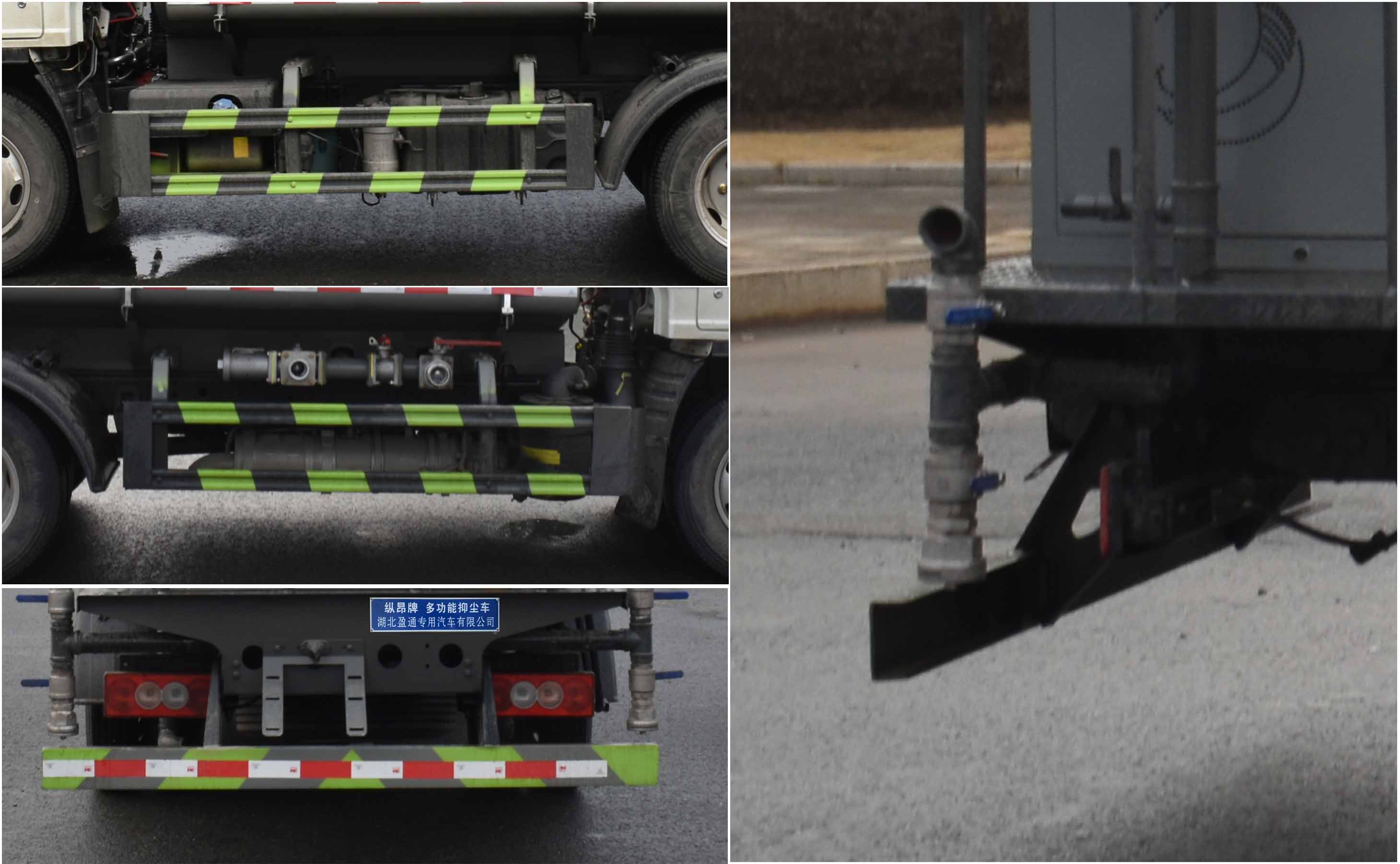 該車用途為抑塵降霾.主要裝置為罐體及噴霧裝置;罐體有效容積:2.6立方米;罐體外形尺寸(×長軸×短軸)(mm):2600×1450×950;2600×1600×1150;ABS型號為CM4XL-4S/4M,生產廠家為廣州瑞立科密汽車電子股份有限公司;側、后防護材料均為:Q235碳鋼,連接方式均為:螺栓連接,后部防護截面尺寸(mm):120×50,后部防護離地高度(mm):360.隨底盤選裝駕駛室,選裝噴霧裝置樣式。