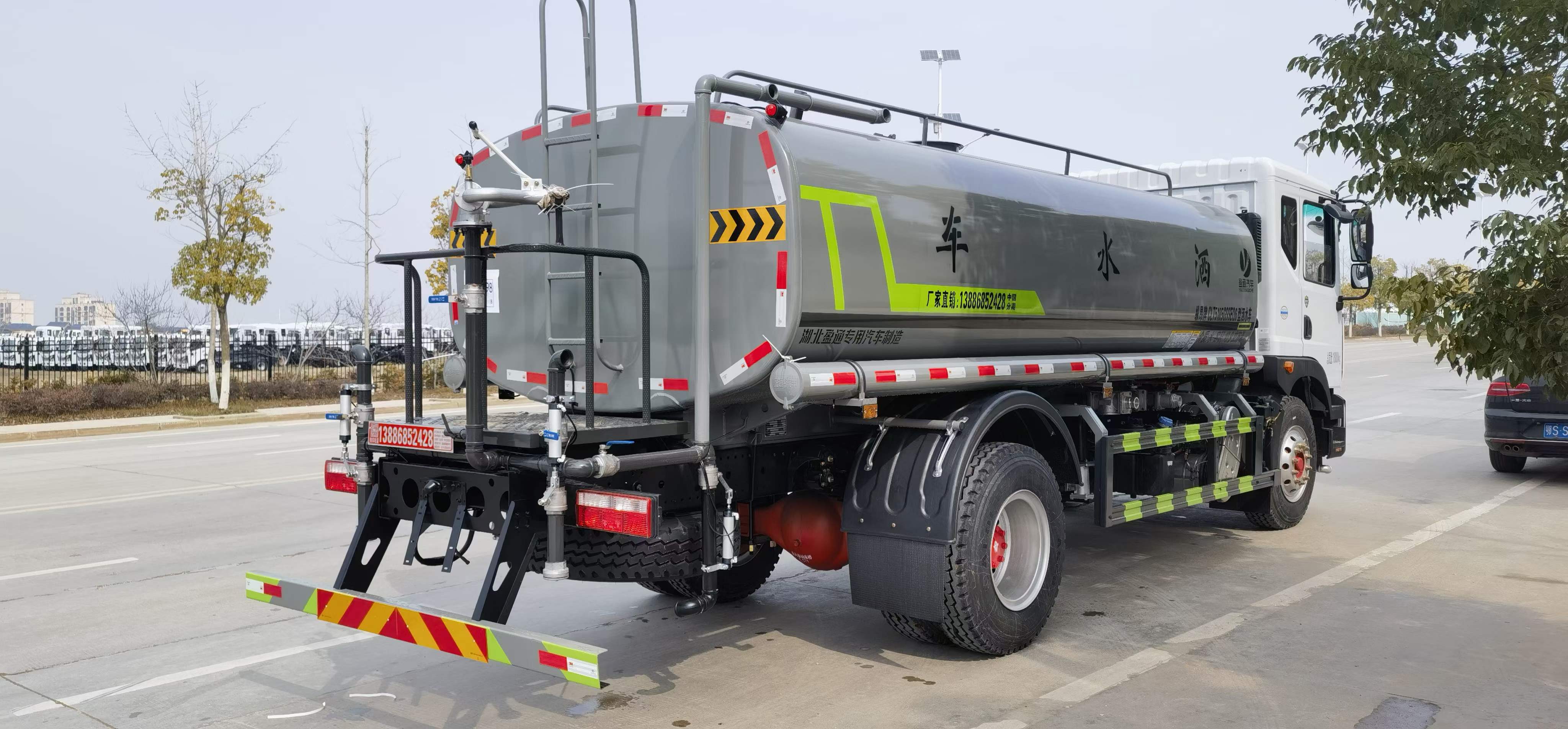 5立方,罐體采用國(guó)標(biāo)Q235碳鋼材質(zhì),罐體厚度4MM,前后封頭5MM加厚型,罐體內(nèi)雙層隔板具有防波蕩作用,以減輕汽車行駛時(shí)罐內(nèi)液體沖擊;灑整車及外形尺寸嚴(yán)格按照機(jī)動(dòng)車公告制作而成;裝配大功率灑水泵,前沖、后灑、側(cè)噴、后平臺(tái)帶綠化灑水炮,灑水炮可旋轉(zhuǎn),可連續(xù)調(diào)成直沖狀、大雨、小雨、毛毛雨;工作范圍:自吸高度:≥7m,灑水寬度:≥14m,射程:≥16m;可調(diào)節(jié)成柱狀,射程≥20m;也可調(diào)節(jié)成霧狀;射程≥5m。配消防接口,自流閥,濾網(wǎng),帶自吸自排功能。前封頭帶水位計(jì),后平臺(tái)主管路帶1寸澆花接口,后爬梯,帶1個(gè)消防接頭,帶1個(gè)自流閥,1個(gè)過(guò)濾裝置,其余標(biāo)配。1、可選裝后平臺(tái)帶霧炮機(jī)組用于噴霧降塵、農(nóng)藥噴灑;2、可選裝前置電子灑水炮駕駛室操作;3、可選裝氣動(dòng)球閥駕駛室操作。