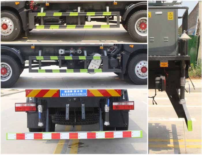 該車主要用于城鄉園林綠化噴灑作業;主要裝置為水罐及噴灑裝置;罐體總容量:10.7立方米;罐體有效容積:10.2立方米;罐體外形尺寸(×長軸×短軸)(mm):4800×2300×1300.ABS系統生產廠家,型號:焦作博瑞克控制技術有限公司,J ABS;襄陽東風隆誠機械有限責任公司,ABS/ASR-24V-4S/4M.側、后防護材料均為:Q235碳鋼,連接方式均為:螺栓連接,后部防護截面尺寸(mm):120×50,后部防護離地高度(mm):480.隨底盤選裝限速裝置,限速89km/h.隨底盤選裝燃油箱,電瓶,尿素罐,儲氣筒左右安裝位置,選裝噴霧裝置樣式.選裝箭頭燈裝置,選裝前部電子水炮裝置樣式,選裝前部不帶電子水炮;當前部帶電子水炮時,前伸500mm,整車長度為9100mm,8550mm;當前部不帶電子水炮時,前伸為0mm,整車長度為8600mm,8050mm.選裝罐體頂部高位花灑裝置及方形罐口,選裝尾部自流口裝置,選裝工具箱.采用底盤4500mm軸距改裝.后軸僅采用鋼板彈簧懸架.