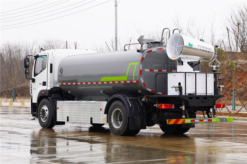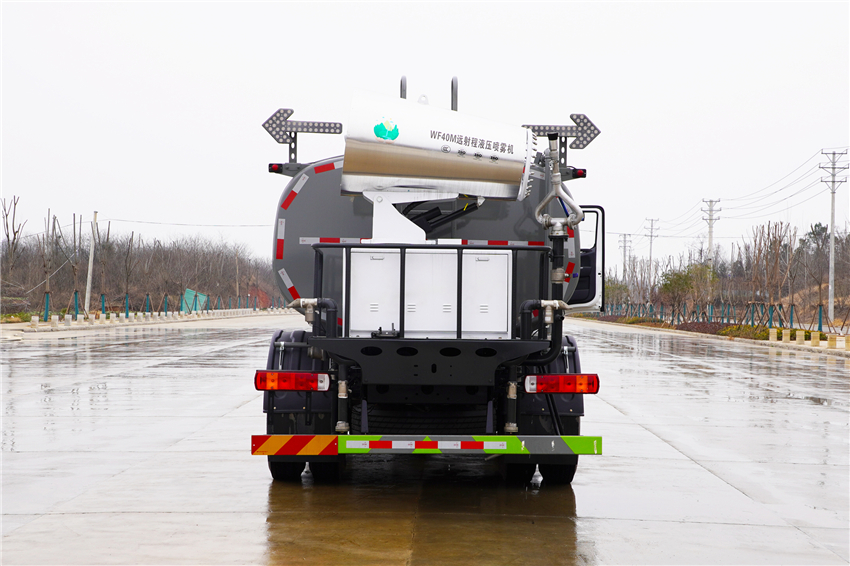 該車主要用于城鄉園林綠化,路面噴灑;主要裝置為罐體及噴灑裝置.罐體總容量:10.6立方米;罐體有效容積10.1立方米;介質:丙酮水溶液,密度950千克/立方米,罐體外形尺寸(×長軸×短軸)(mm):4600×2300×1450.側防護采用電池護罩代替,材料為Q235碳鋼,螺栓連接;后防護材料為:Q235碳鋼,連接方式為:螺栓連接,后部防護截面尺寸(mm):120×50,后部防護離地高度(mm):490;ABS型號/生產企業:ABS-E/采埃孚商用車系統(青島)有限公司;電池種類:磷酸鐵鋰電池,儲能裝置單體生產企業:寧德時代新能源科技股份有限公司,儲能裝置總成生產企業:寧德時代新能源科技股份有限公司;電機型號/生產企業:TZ375XSSF-SZF611/陜西法士特齒輪有限責任公司,額定功率:105kW,峰值功率:175kW.選裝前部電子水炮樣式,選裝前部不帶電子水炮,該狀態下車長為8100mm;當前部安裝電子水炮時,車長為8600mm,車輛前伸500mm.后部箭頭指示燈僅在車輛作業時開啟.選裝車輛前部鴨嘴裝置.